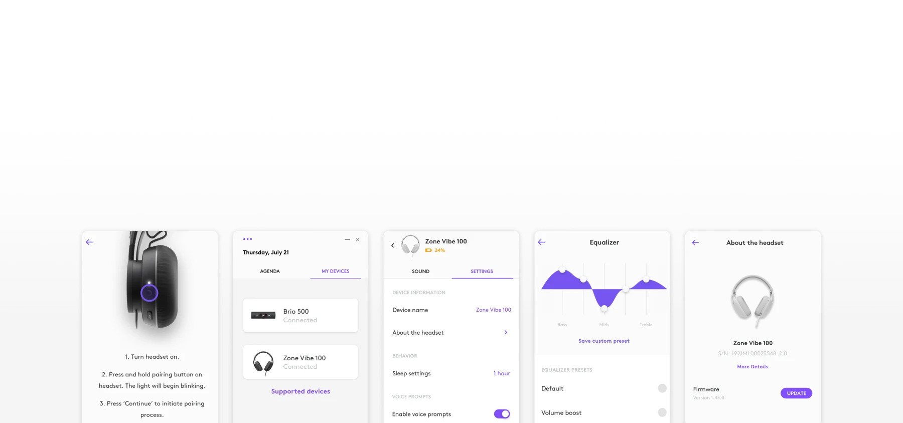 Preuzmite kontrolu nad svojom glazbom i sastancima kroz Logi Tune, softver za računala i mobilne uređaje unutar kojeg se može podesiti snaga reprodukcije vlastitog glasa, razina tonaliteta. Logi Tune može opsluživati više Logitech slušalica i audio-video uređaja, te se kroz njega vrše i softverske nadogradnje.